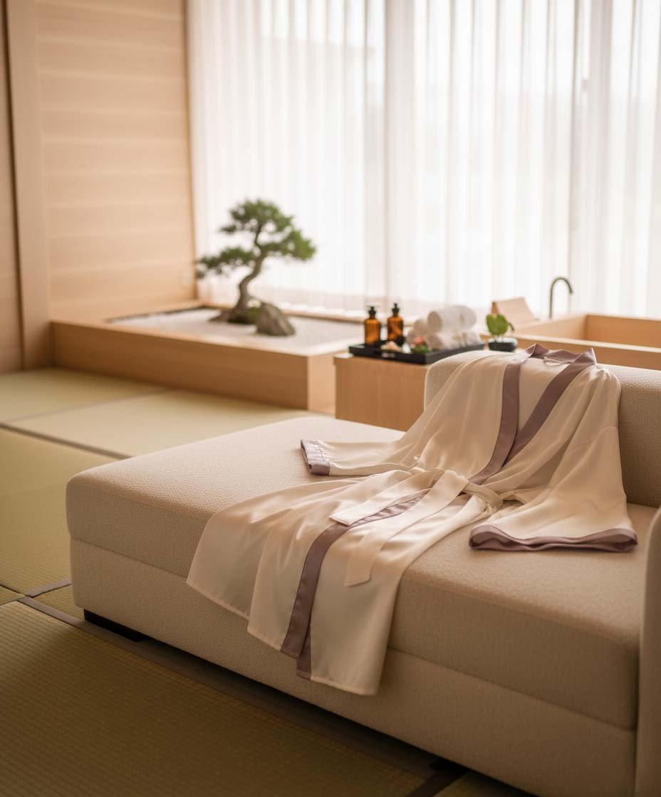 De satijn beige dames kimono die je op deze pagina ziet, straalt tijdloze elegantie en comfort uit. Deze veelzijdige kimono is ontworpen om je dagelijkse routine te verrijken met een vleugje luxe, of je nu thuis ontspant, op reis bent, of geniet van een verkwikkende sauna.